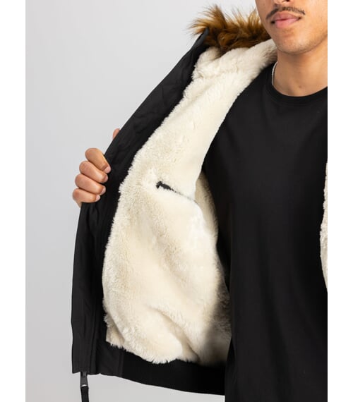 Bunda je vybavena pevnou kapucí s výrazným lemováním z umělé kožešiny. Vnitřní část je opatřena měkkou, hustou podšívkou pro zvýšení tepelné izolace. Zapínání je řešeno pomocí předního zipu.