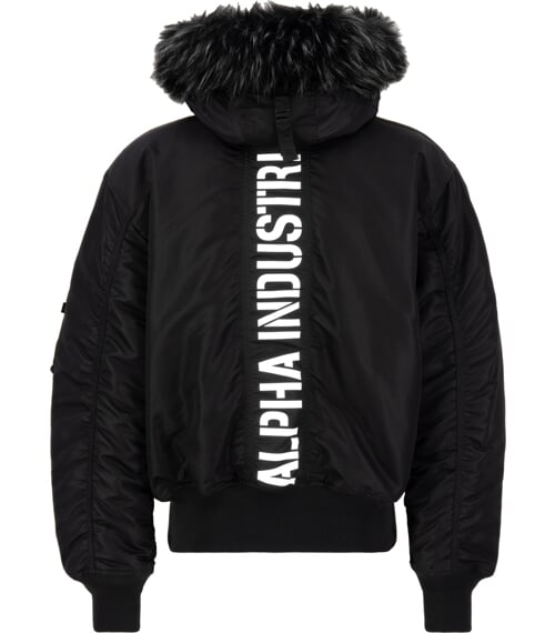 Hrudní část je doplněna nášivkou s logem Alpha Industries. Zadní strana je opatřena výrazným vertikálním nápisem „ALPHA INDUSTRIES“. Rukávy i spodní lem jsou zakončeny pružnými náplety.