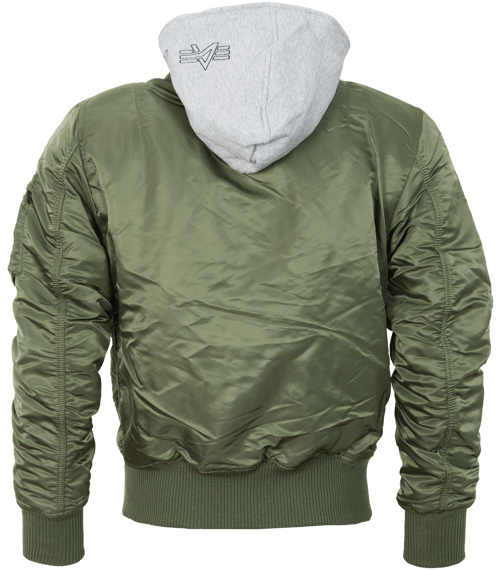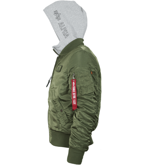 Kapuce z příjemného úpletu chrání před větrem, s výšivkou "Alpha" dobře vypadá, a díky prodloužení úpletu (vsadky) po celé délce předního zipu působí bunda jako kombinace mikiny  a bomberu.  MA-1 z ní uděláte prostým odejmutím úpletového dílu s kapucí, který je s bundou spojen zipem.
