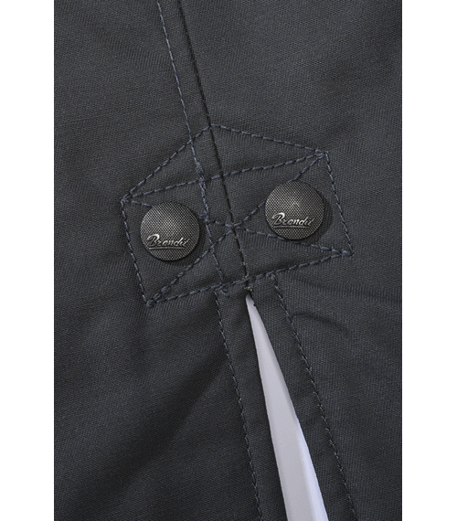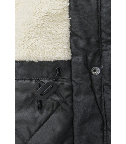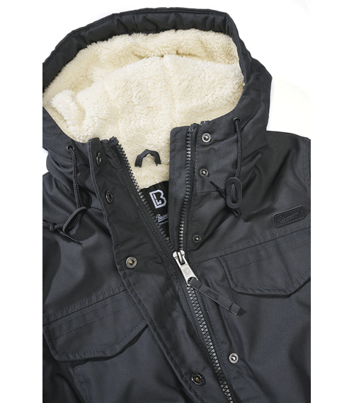 Bunda je vybavena pevnou kapucí se stahováním a vysokým límcem pro lepší ochranu proti větru. Zapínání je řešeno kombinací předního zipu a krycí légy s druky.