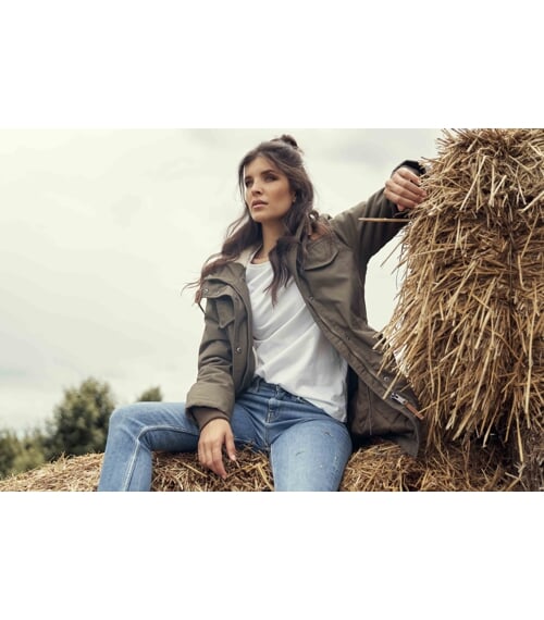 Na přední straně se nacházejí dvě náprsní kapsy s klopou a dvě spodní kapsy. Spodní část je tvarována do mírného oblouku se zadním prodloužením pro lepší krytí zad. Vnitřní zateplení zajišťuje tepelný komfort i při nižších teplotách.