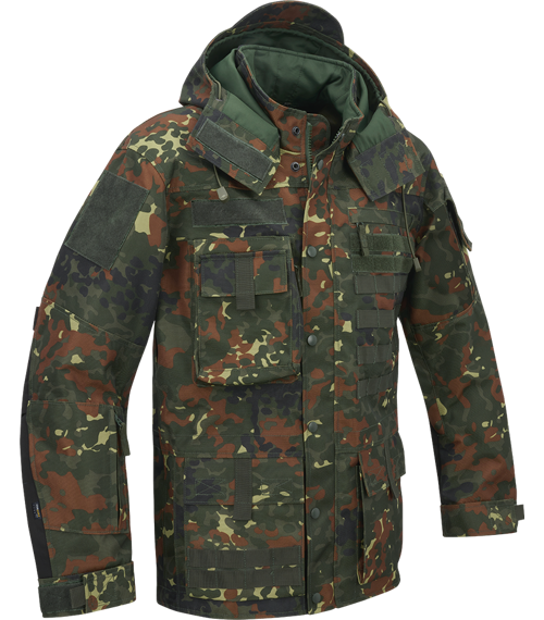 • další prvky Molle systému na přední části bundy - 4 pásky ×  6 polí, a dva pásky × 4 pole v podobě velcro panelu pro možnost uchycení nášivek
