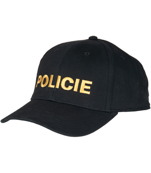 Černá profesní kšiltovka se žlutě vyšitým nápisem POLICIE určená pro příslušníky policejního sboru.