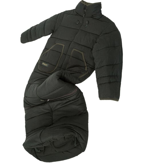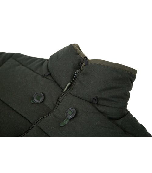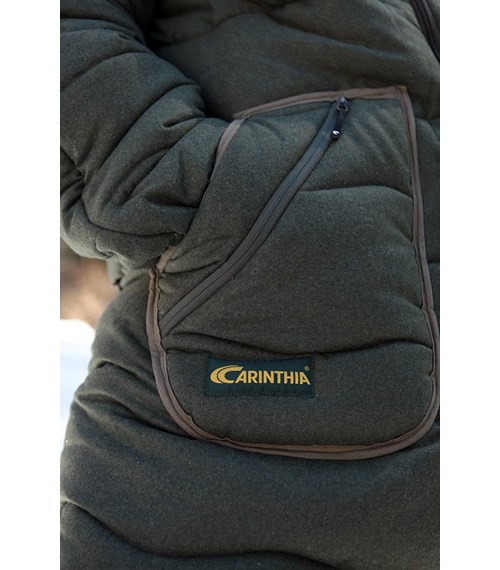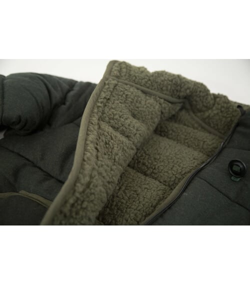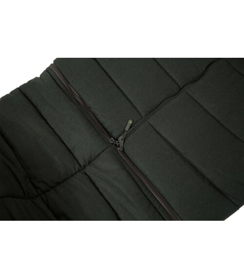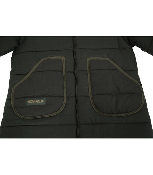 Um eine Kältebrücke beim Frontreißverschluss zu vermeiden wurde er mit einer angeschnittene Windschutzleiste mit Klemmschutz versehen. An den Seiten befinden sich 2 große Mufftaschen mit innen integrierten Reißverschlusstaschen zum sicheren Aufbewahren von Gegenständen. Das Fußteil ist komplett abnehmbar bzw. mit 2 Lederlaschen im hinteren Hüftbereich hochklappbar und mittels Knopf fixierbar.