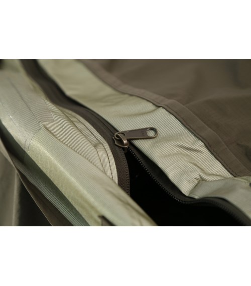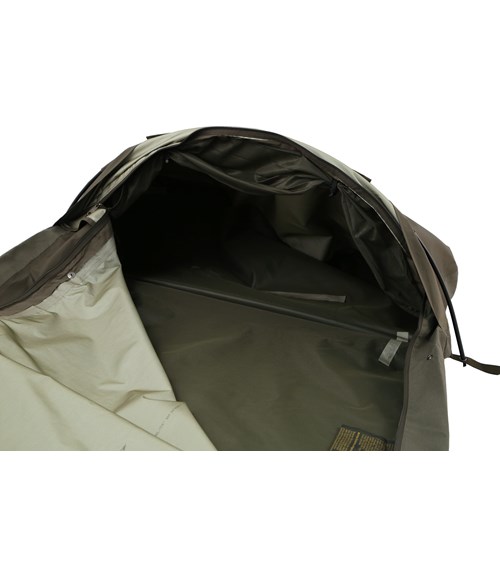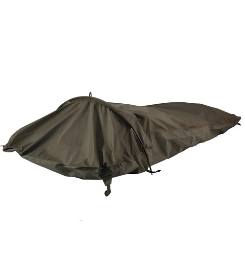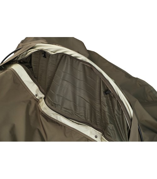 A comfortable bivy bag with a tent pole arch in the head area (single pole supported). There is enough space at the head end for equitment that needs to be at hand day and night.