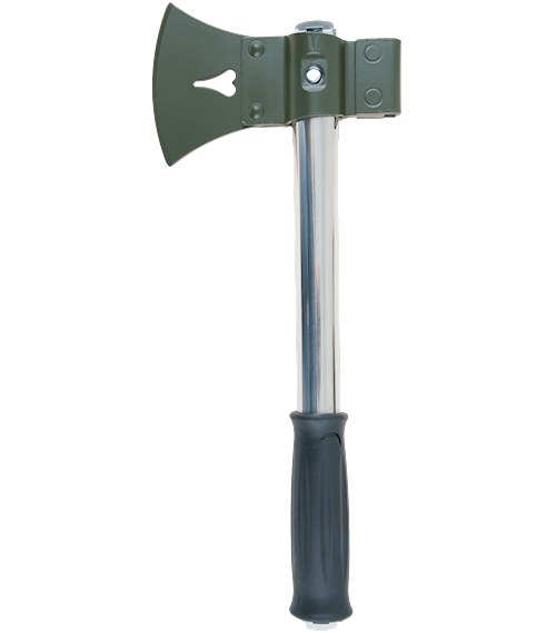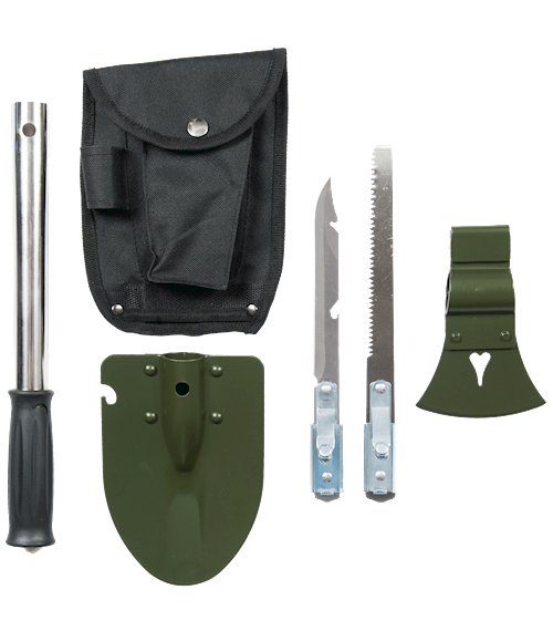 besteht aus: Universalstiel, Beil, Spaten, Säge, Messer mit Flaschenöffner, Transporttasche