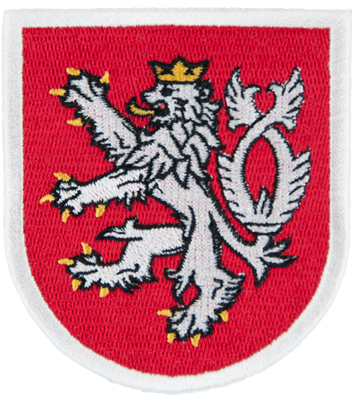 • Nášivka ve tvaru zaoblené pavézy s detailní výšivkou bílého dvouocasého lva na červeném pozadí.
