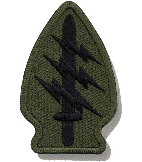 „Nášivka je ve tvaru šípového hrotu, ten odkazuje na dovednosti amerických indiánů, ve kterých jsou příslušníci útvaru Speciálních sil vycvičeni. Dýka představuje nekonvenční povahu operací Speciálních jednotek a tři blesky, jejich schopnost rychle zasáhnout ať už ve vzduchu, na vodě nebo na zemi. Modrá a žlutá jsou barvy nepřiřazených jednotek." U.S. Army Institute of Heraldry