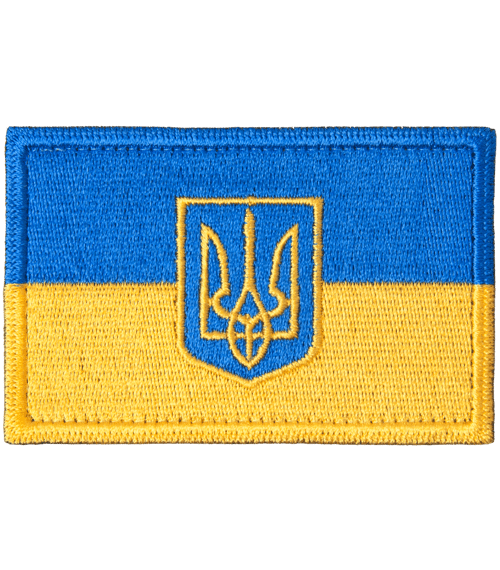 Vlajka Ukrajiny se státním znakem Ukrajiny (trojzubec).