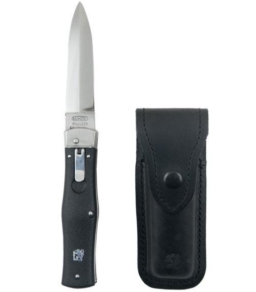 • Vyhazovací nůž s tvarovanou rukojetí z černé matné hmoty a čepelí ve tvaru listu s jednostranným břitem