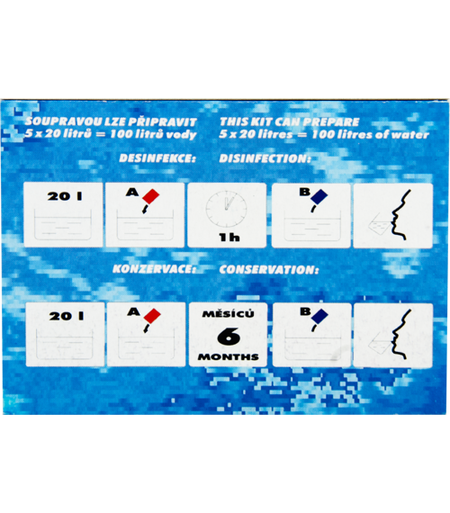 - Po uplynutí 60 minut od aplikace činidla A se do vody přidá činidlo B a po následném protřepání je již voda připravená k použití. Takto ošetřenou vodu je nutno chránit před následnou bakteriální kontaminací v uzavřené nádobě a spotřebovat ji do 2 dnů