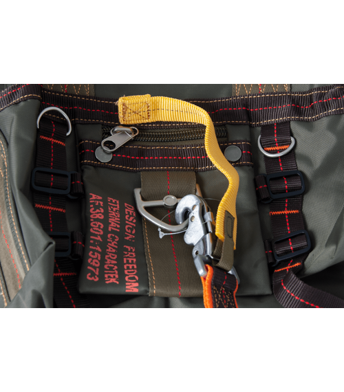 Na čelní stěně se nachází kapsa uzavíraná opět zdrhovadlem. K tašce je přišitá horní strana kapsy, dvě boční jsou k tašce uchyceny dvěmi očky po každé straně. Na kapse je kovové oko, k němu je přichycena stylová mohutná kovová karabina se žlutým ozdobným popruhem