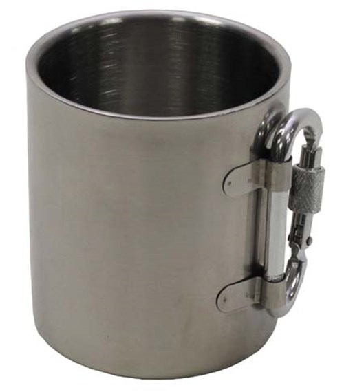 Karabina se šroubovacím uzávěrem je funkční a hrníček lze tudíž také snadno zavěsit např. na opasek, na úchyt batohu nebo jiné součástky výstroje.