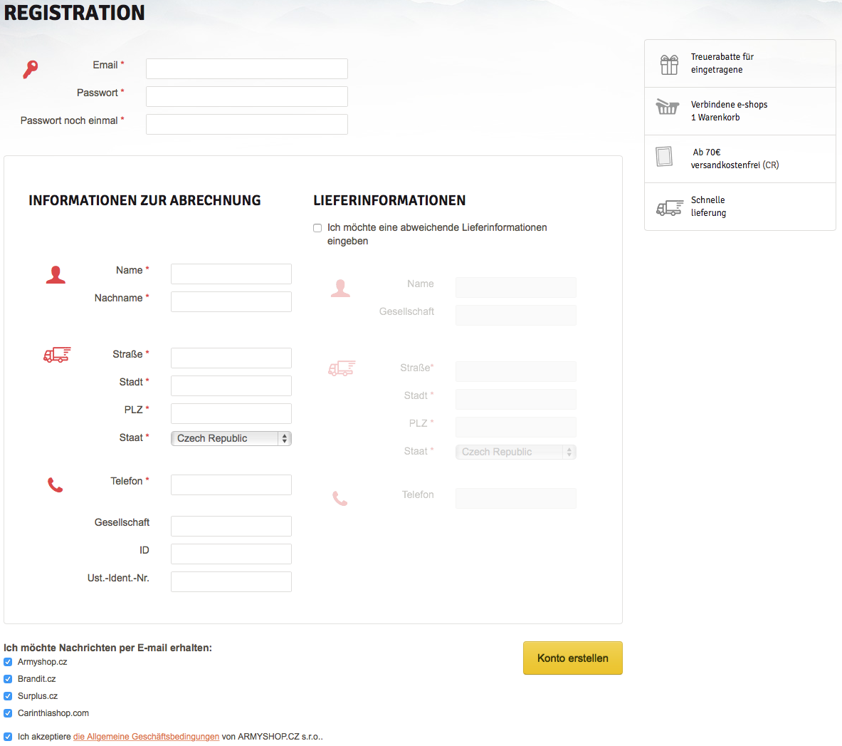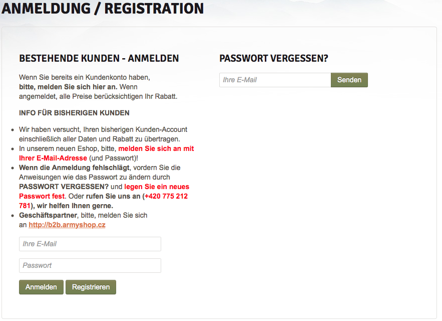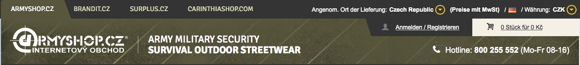 Wenn Sie in einem unserer früheren E-Shops unter den Domänen ARMYSHOP.CZ, SURPLUS.CZ, BRANDIT.CZ und/oder CARINTHIASHOP.COM registriert wurden, benutzen Sie als Benutzernamen nicht mehr Ihr ursprüngliches Login, sondern jene E-Mail-Adresse, die Sie als Kommunikationsadresse bei der Registrierung angegeben haben. Sie können dasselbe Passwort benutzten wie bis jetzt.