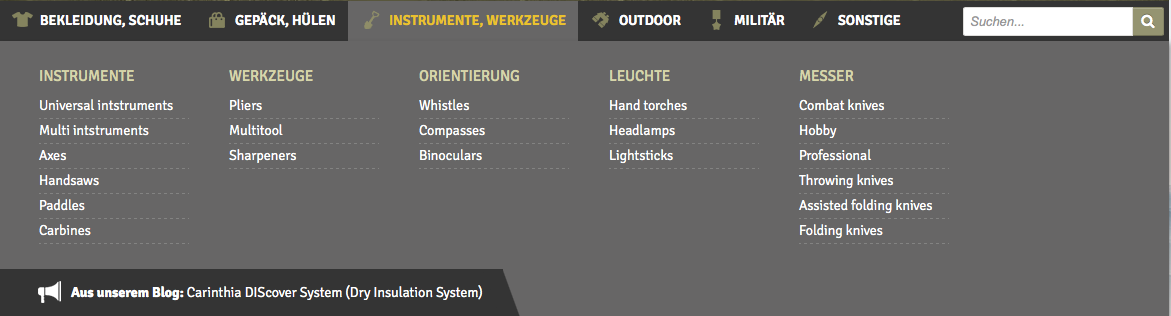 Im Geschäft können Sie unter den einzelnen Produktkategorien wählen und sich das Angebot ansehen. Der Zugang zu den Produktkategorien erfolgt über die horizontale Hauptmenüleiste oben.