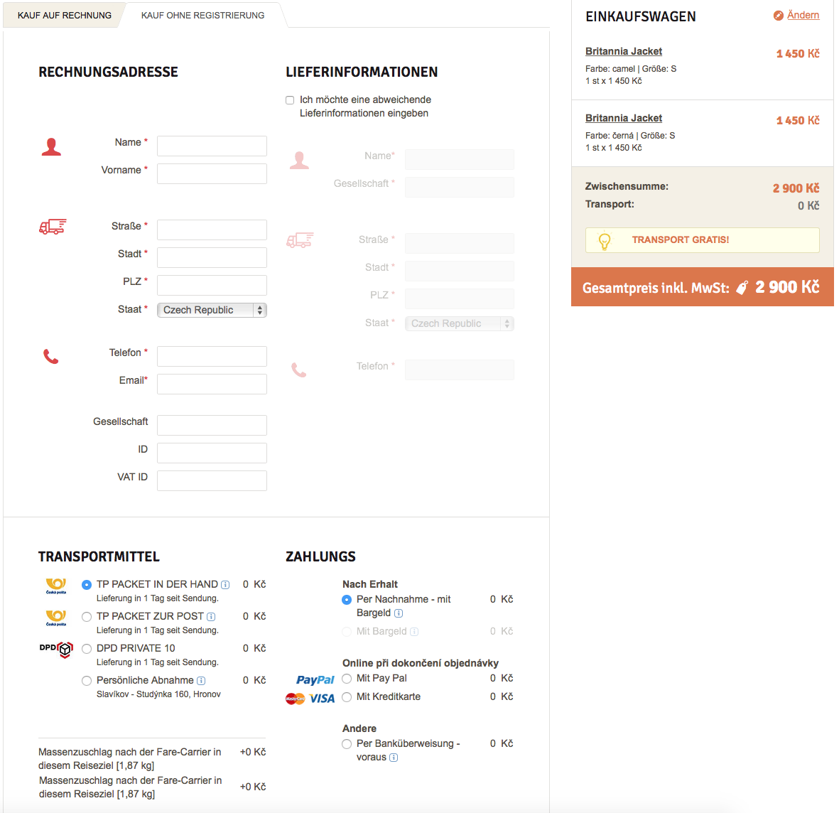 Wenn Sie bei der Bestellung die Option OHNE REGISTRIERUNG BESTELLEN wählen, ist es notwendig, die zur Abwicklung der Bestellung erforderlichen Angaben einzugeben. Die mit einem Stern markierten Felder sind Pflichtfelder und müssen ausgefüllt werden. Die Angaben des Bestellers werden ausschließlich zur Ausführung der jeweiligen Bestellung verwendet.
