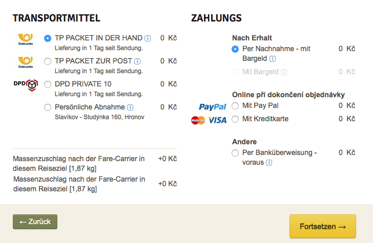 Nach dem Einloggen auf eine der vorgenannten Weisen können Sie den Bestellvorgang fortsetzen, indem Sie eine der Versand- und Zahlungsweisen wählen.