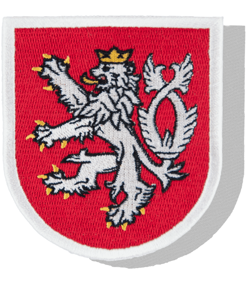 • Nášivka ve tvaru zaoblené pavézy s detailní výšivkou bílého dvouocasého lva na červeném pozadí.
