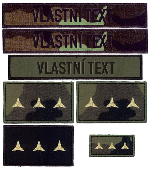 • Pro usnadnění objednávání nabízíme typickou vojenskou sadu jmenovek včetně potřebného hodnostního označení na polní uniformu a svetr