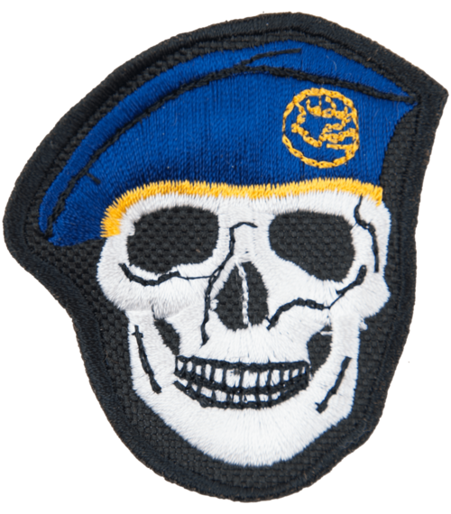 • Precizně vyšitá lebka s tmavomodrým baretem.