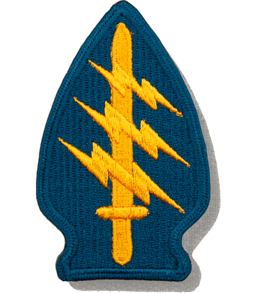 „Nášivka je ve tvaru šípového hrotu, ten odkazuje na dovednosti amerických indiánů, ve kterých jsou příslušníci útvaru Speciálních sil vycvičeni. Dýka představuje nekonvenční povahu operací Speciálních jednotek a tři blesky, jejich schopnost rychle zasáhnout ať už ve vzduchu, na vodě nebo na zemi. Modrá a žlutá jsou barvy nepřiřazených jednotek." U.S. Army Institute of Heraldry