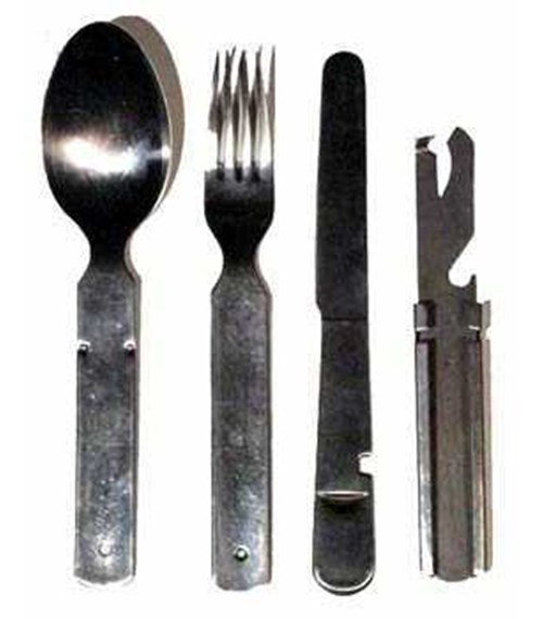 Komplet je vyroben z nerez oceli a obsahuje čtyři části - nůž, vidličku, lžíci a držák, který je zároveň uzpůsoben k otvírání konzerv a korunkových uzávěrů na láhvích