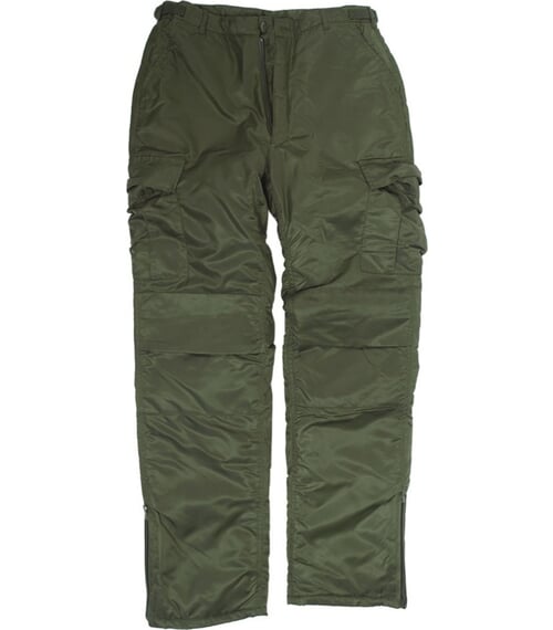 Dvě průhmatové kapsy vpředu, dvě kapsy vzadu kryté patkami, dvě velké (vakové) kapsy na bocích stehen rovněž kryté patkami. Patky kapes jsou zapínané pomocí knoflíků