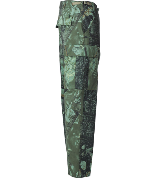 Classic US ARMY BDU (Battle Dress Uniform) pants made of RIP-STOP cotton. 2 front slash pockets, 2 back flap pockets, 2 cargo pockets, adjustable waist, drawstrings on leg cuffs, reinforced seat and knees, button fly, 100 % cotton