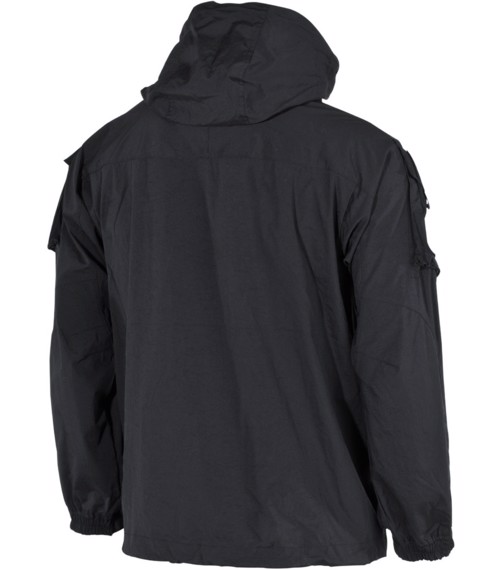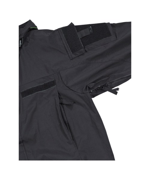 PCU- protective combat uniform, waterproof, windproof, breathable, sleeves with velcro closure and velcro patches, adjustable VELCRO wrist cuffs, 2 cargo breast pockets with zipper, waistband with elastic drawstring, zippered arm for ventilation, diff. velcro patches, concealed hood in collar, front zip with wind selvage, outer material: 98 % Nylon, 2 % Spandex