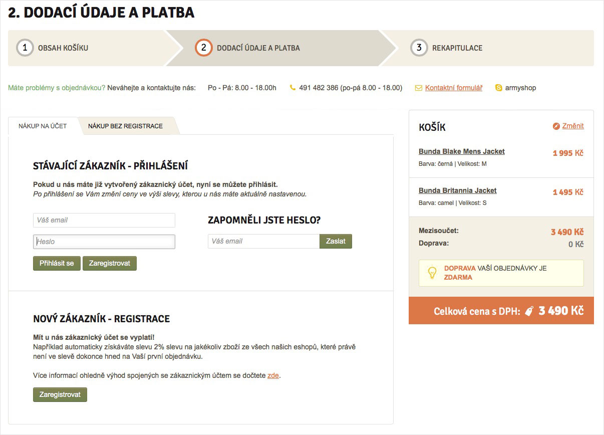 Druhým krokem nákupního procesu je bod 2. DODACÍ ÚDAJE A PLATBA. Na tomto místě máte možnost dokončit NÁKUP BEZ REGISTRACE, anebo v případě, že již máte vytvořený zákaznický účet, můžete se přihlásit a dokončit NÁKUP NA ÚČET.