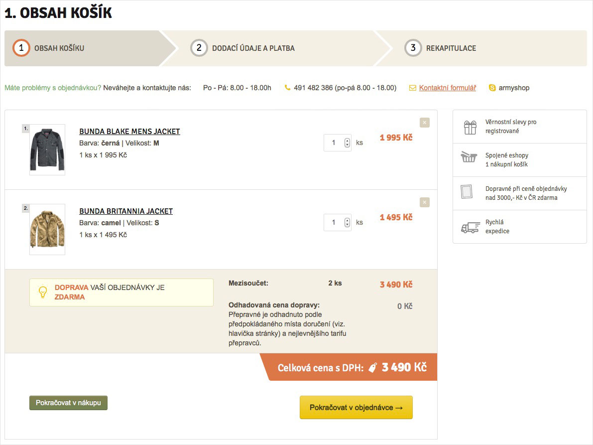 Použitím tlačítka Editovat košík se dostanete do prvního kroku nákupního procesu: 1. OBSAH KOŠÍKU. Zde máte možnost upravit přepsáním čísla počet nakupovaného zboží, pomocí křížku v pravém horním rohu na produktu zboží odstranit z nákupního košíku a v případě použití tlačítka Pokračovat v nákupu vložit do košíku další vybrané zboží. Po všech zmiňovaných úpravách systém automaticky přepočítá nákupní košík. V případě, že jste s výběrem zboží spokojeni, můžete přejít K pokladně.