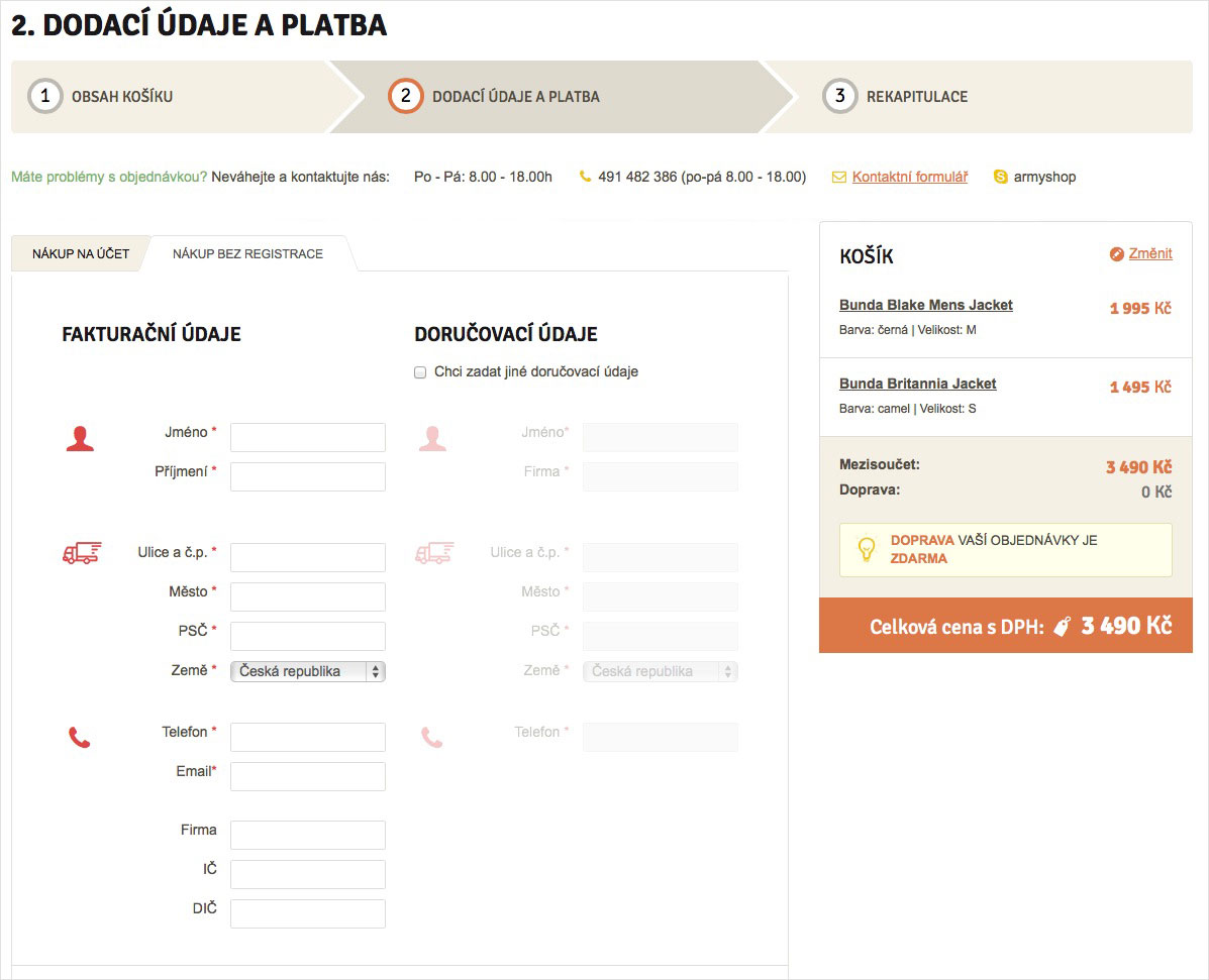 Pokud k dokončení objenávky použijete záložku NÁKUP BEZ REGISTRACE je nutné vyplnit údaje potřebné k vyřízení objednávky. Položky označené hvězdičkou jsou povinné. Poskytnuté informace budou použity pouze k doručení právě sestavené objednávky.