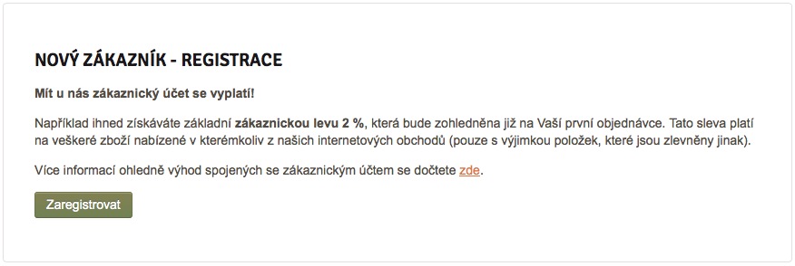 Pokud jste v našem internetovém obchodě poprvé a chcete se zaregistrovat, použijte v druhé části přihlášení NOVÝ ZÁKAZNÍK - REGISTRACE tlačítko Zaregistrovat