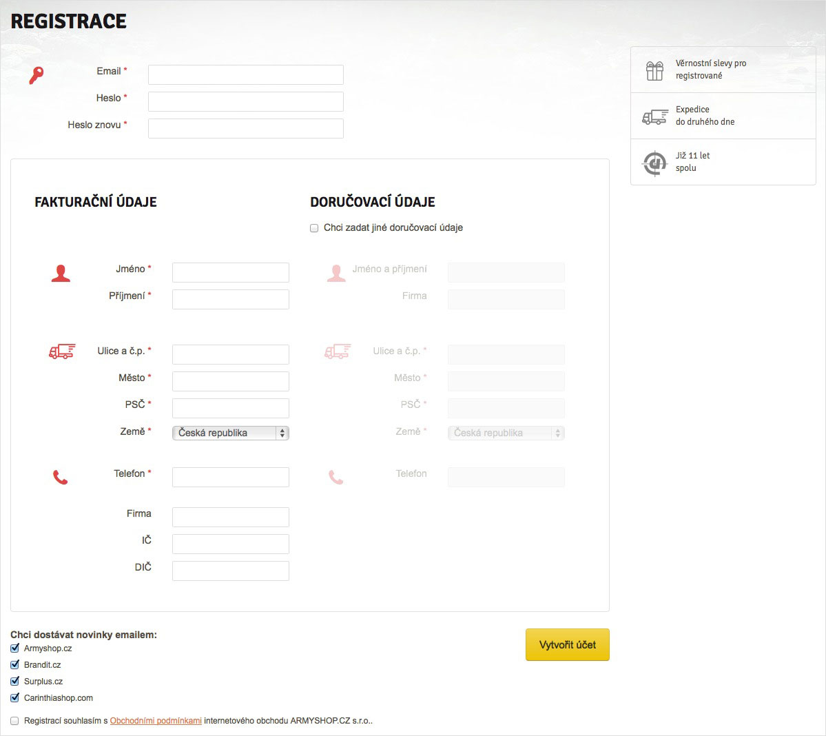 Zde vyplňte všechny potřebné údaje. Položky označené hvězdičkou jsou povinné a jsou nutné k vyřizování Vašich nákupů. Tyto údaje si můžete, kdykoliv po přihlášení měnit podle Vaši potřeby. Ve spodní části registrace se seznamte s obchodními podmínkami a zaškrtnutím políčka vyjádřete souhlas. Zmáčknutím tlačítka Vytvořit účet je proces registrace ukončen a v hořejším navigačním pruhu se objeví Vaše jméno. Tímto jste přihlášen a můžete využívat výhod registrovaného zákazníka a začít nakupovat.