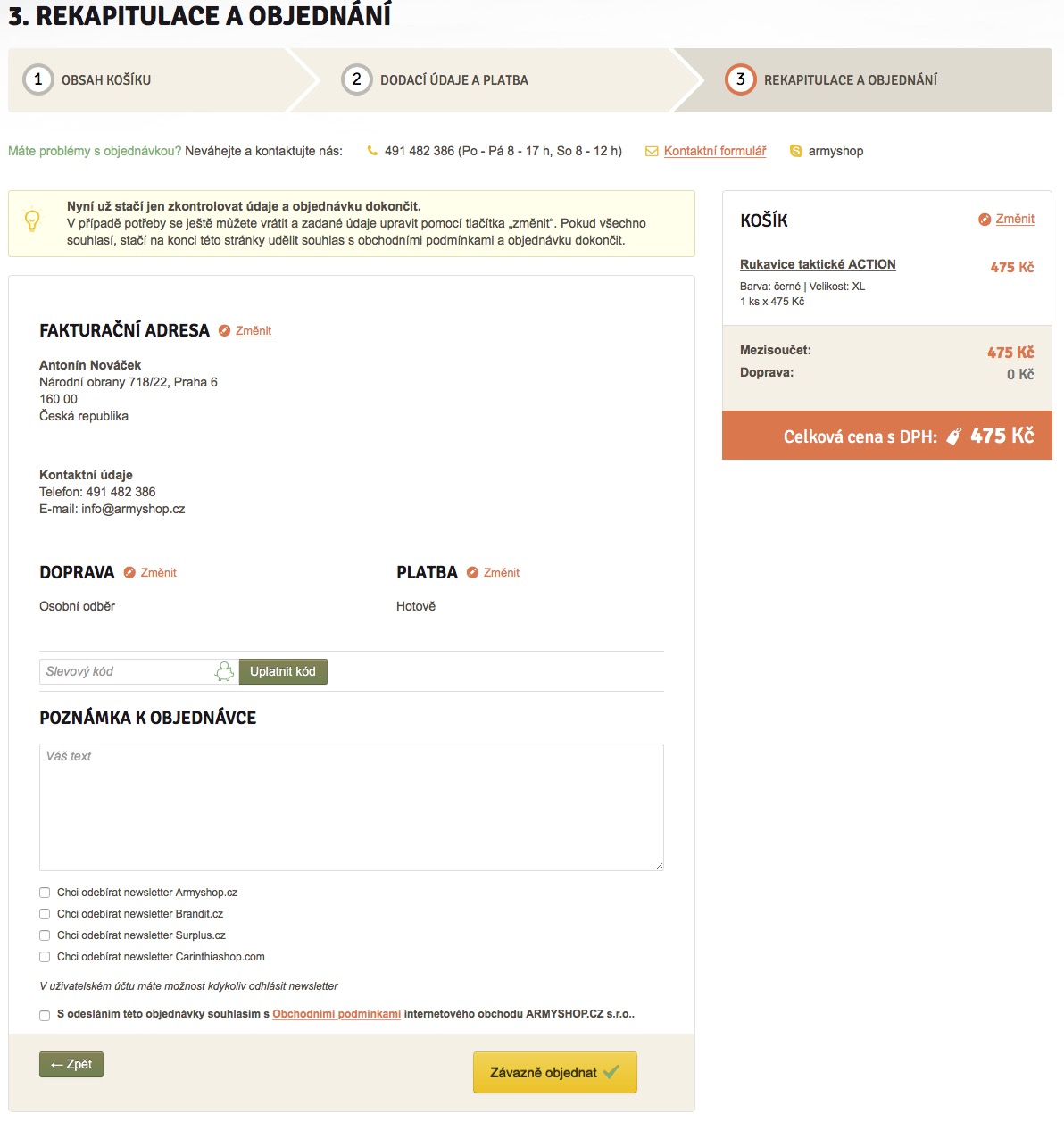 Pote, můžete žlutým tlačítkem Pokračovat do posledního kroku 3. REKAPITULACE. V této rekapitulaci máte možnost překontrolovat FAKTURAČNÍ ADRESU, DORUČOVACÍ ADRESU, DOPRAVU, PLATBU. Níže můžete uplatnit slevový kód a napsat případnou poznámku k objednávce. Případné chyby a nepřesnosti lze napravit pomocí tlačítka Změnit. Po překontrolování údajů v rekapitulaci vyslovíte zaškrtnutím políčka souhlas s VOP a můžete dokončit nákupní proces zmáčknutím žlutého tlačítka Závazně objednat.