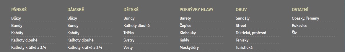 Najetím kurzoru na zobrazení kategorie se Vám zobrazí Skupiny produktů ze kterého můžete vybírat požadovaný typ zboží s vyobrazením. Kliknutím na zobrazený produkt se dostanete na detail produktu, na kterém najdete vše potřebné (barvu, velikost, dostupnost, popis produktu, cenu) k případnému vložení zboží do nákupního košíku.