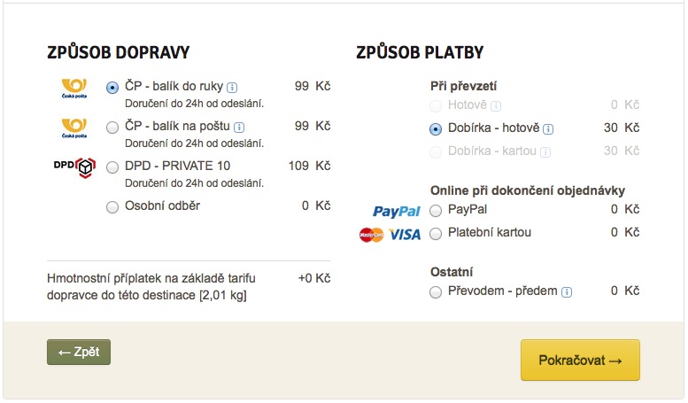 Po přihlášení jedním z výše uvedených způsobů můžete pokračovat v nákupním procesu, kdy si zvolíte jeden z nabízených ZPŮSOB DOPRAVY a ZPŮSOBŮ PLATBY