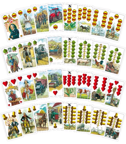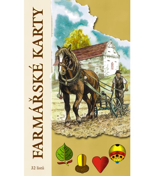 Soupravy klasických jednohlavých hracích karet (32 listů) obohacené o tématické reálie farmářské - tradice, zvyklosti, historické osobnosti spojené se zemědělstvím, zemědělská zvířata a stroje.