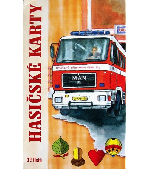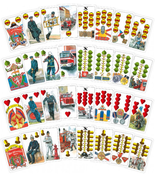 Soupravy klasických jednohlavých hracích karet (32 listů) obohacené o tématické reálie hasičské - výložky, znaky a medaile hasičů, jejich uniformy, stříkačky, helmy a hasicí přístroje, hasiči při nasazení.