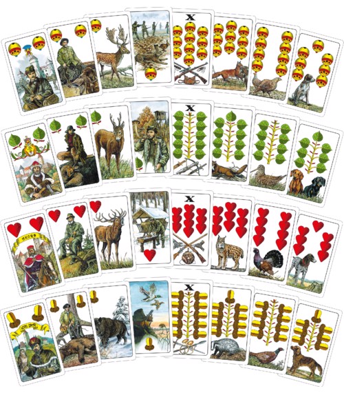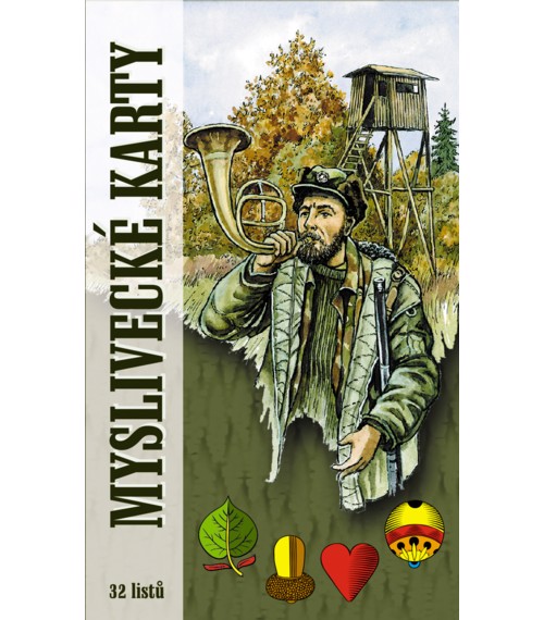 Soupravy klasických jednohlavých hracích karet (32 listů) obohacené o tématické reálie myslivecké - panovníci Českých zemí, myslivci a lovci, lesní zvěř a ptactvo, lovecké scény, lovecké zbraně, lovečtí psi.