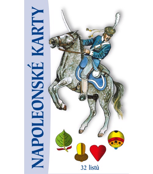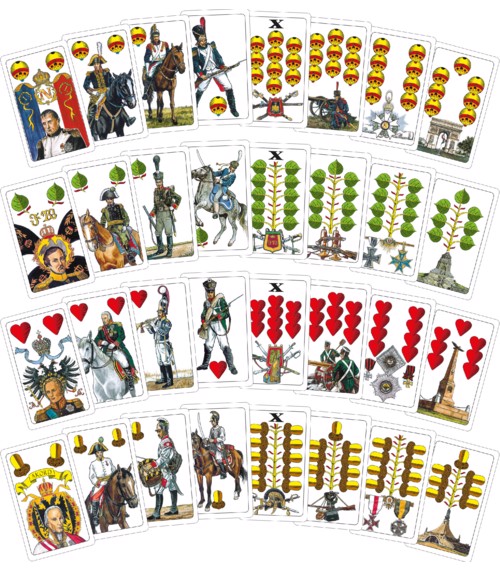 Soupravy klasických jednohlavých hracích karet (32 listů) obohacené o tématické reálie napoleonské - panovníci Francie, Ruska, Německa a Rakouska-Uherska, důstojníci a vojáci, výstroj a výzbroj, řády a vyznamenání, pomníky a mohyly .