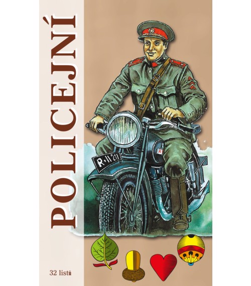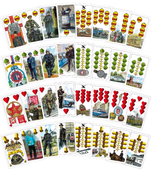 Soupravy klasických jednohlavých hracích karet (32 listů) obohacené o tématické reálie policejní - policejní motivy ze 4 historických období - Rakousko-Uhersko, 1. republika a protektorát, doba komunismu, současnost; uniformy, instituce, odznaky, věznice, obvyklé policejní činnosti.
