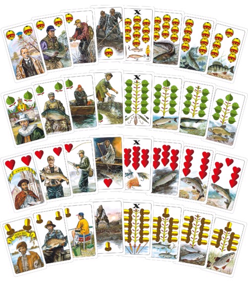 Soupravy klasických jednohlavých hracích karet (32 listů) obohacené o tématické reálie rybářské - slavné postavy českého rybářství, historické způsoby lovu ryb, sportovní rybáři v akci a hlavně ryby.
