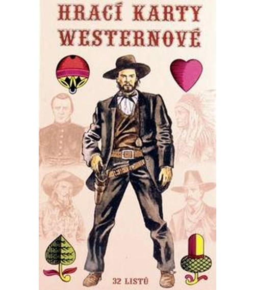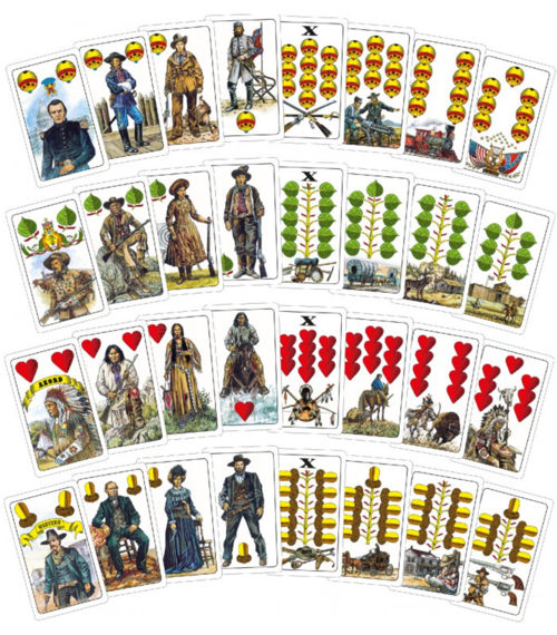 • Soupravy klasických jednohlavých hracích karet (32 listů) obohacené o tématické reálie westernové - žaludy: pistolníci, zelené: zálesáci, srdce: indiáni, kule: Sever / Jih.