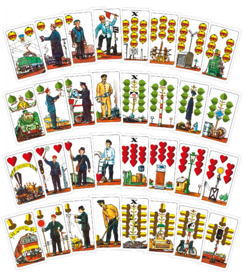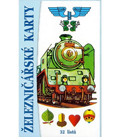 Soupravy klasických jednohlavých hracích karet (32 listů) obohacené o tématické reálie železničářské - historické i současné lokomotivy a drážní přístroje, zaměstnanci drah při obvyklých činnostech.