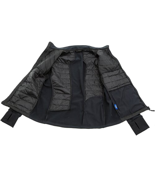 - zip s tahačem pro lepší manipulaci v rukavicích, zip podložen légou jako ochranou proti únikům tepla, léga s úpravou proti poškození (prodření) od tahače