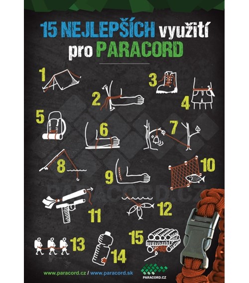 • Při pobytu v přírodě je chybějící provaz špatně nahraditelný. Šňůra z náramku Vám může pomoci také jako náhrada při stavbě přístřešku nebo opravě vybavení. Možnosti využití jsou limitovány pouze fantazií.