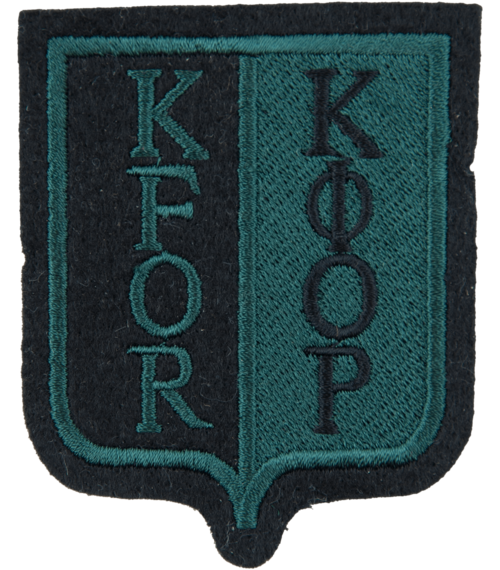 • Na filcovém podkladě vyšitý znak se dvěma svislými nápisy KFOR (latinkou a azbukou)
