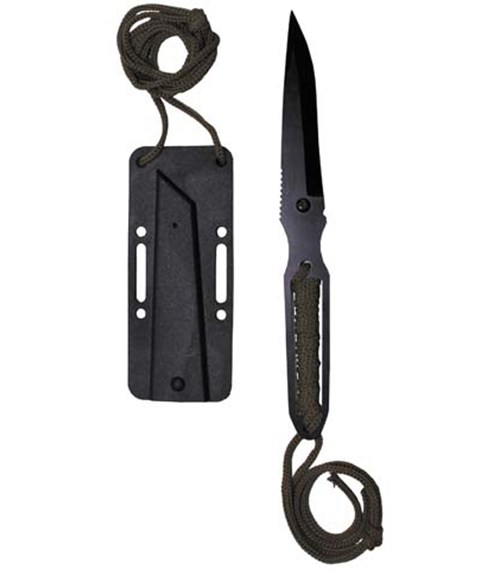 Nůž je dodávaný s plastovou pochvou opatřenou klipem pro zavěšení na opasek. Pochvu lze na opasek nebo popruh na výstroji rovněž zavěsit průvlekem o šířce 25 mm.