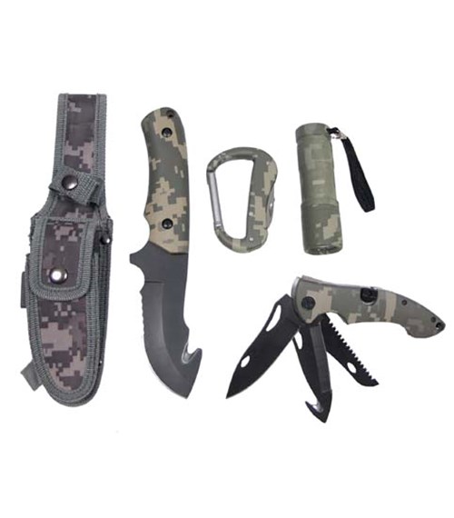 • Tato souprava se skládá z pevného nože, zavíracího nože, karabiny, která je opatřena dalšímy nástroji (nůž, nůžky, šroubovák a otvírák) a duralovou svítilnou (9 LED diod).